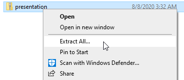 Note that the top-left back button isn't clickable. The title "Extract Compressed (Zipped) Folders" is generic and plural. It doesn't reflect the fact that we extract a specific file named presentation.zip.